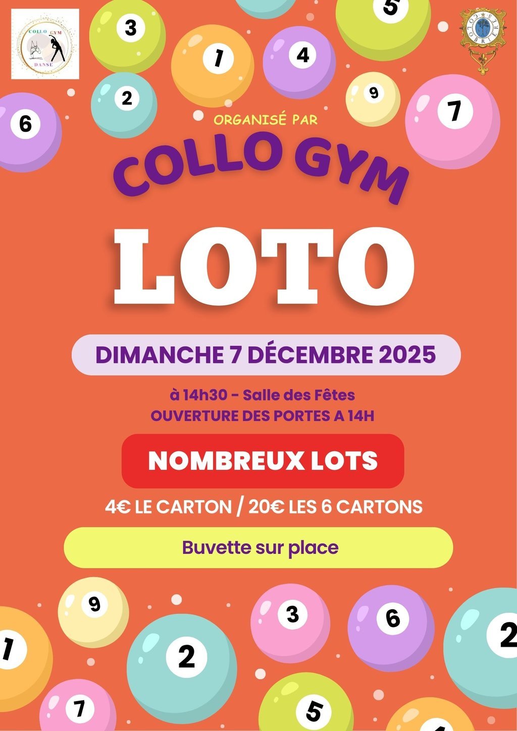 Venez participer au loto organisé par l'association Collo Gym le dimanche 7 décembre à 14h30 à la salle des fêtes !