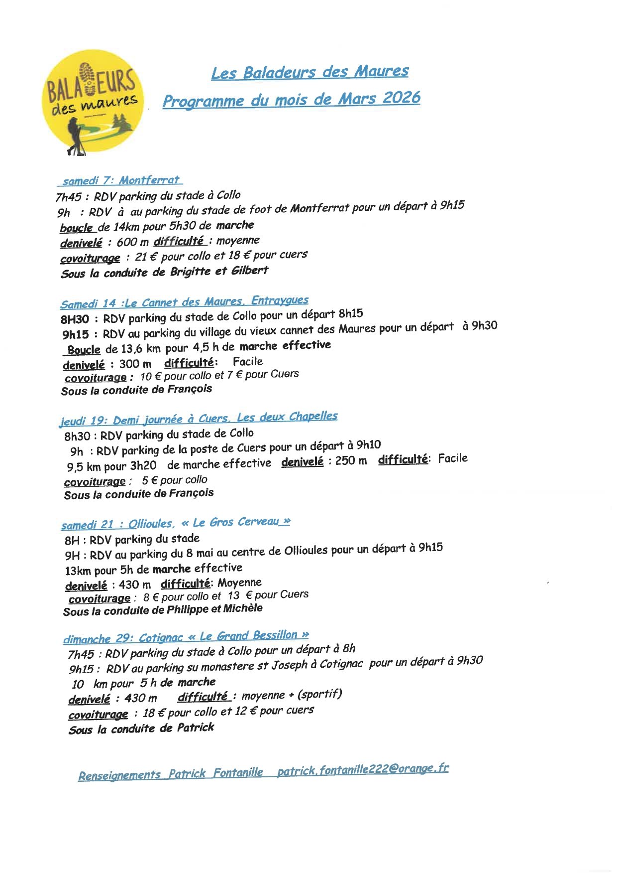 BALADEURS DES MAURES : PROGRAMME DU MOIS DE MARS