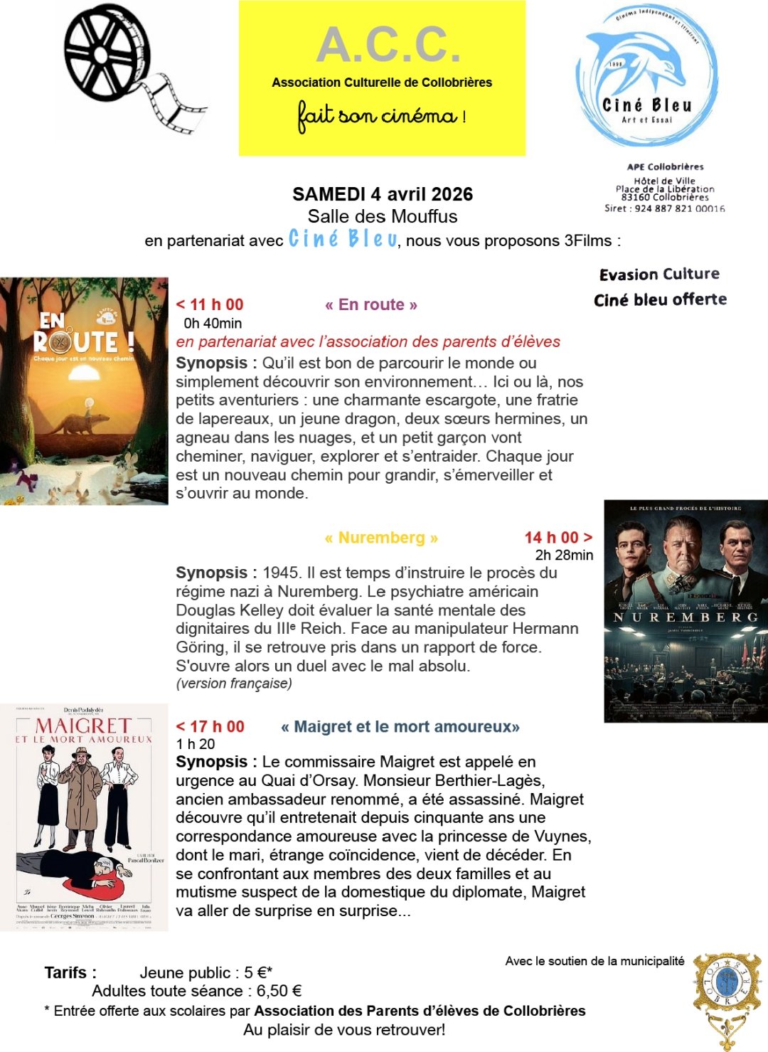 L'ACC et l'Association Ciné bleu vous proposent une projection de 3 films le samedi 4 avril à la salle des Mouffus :